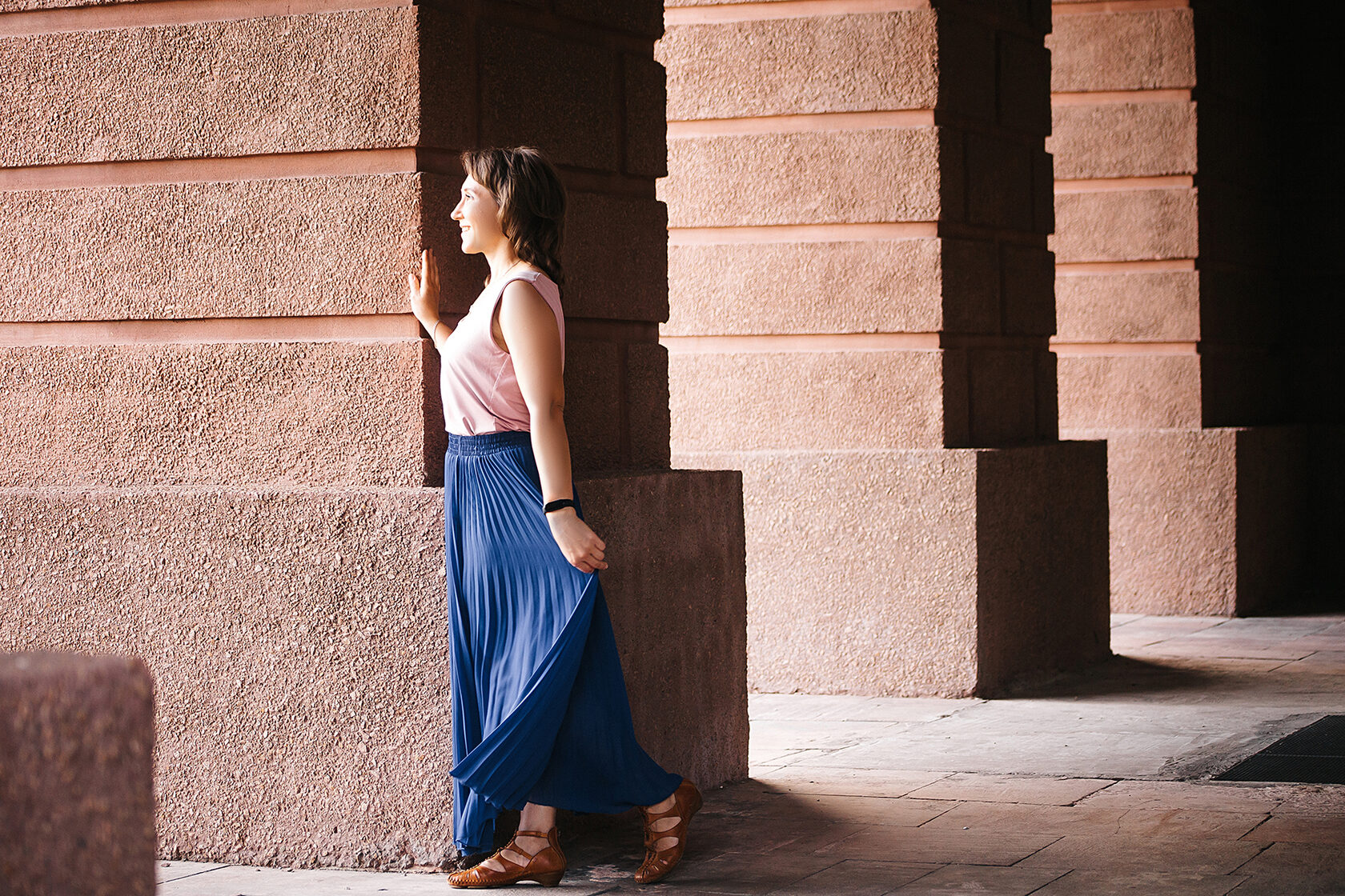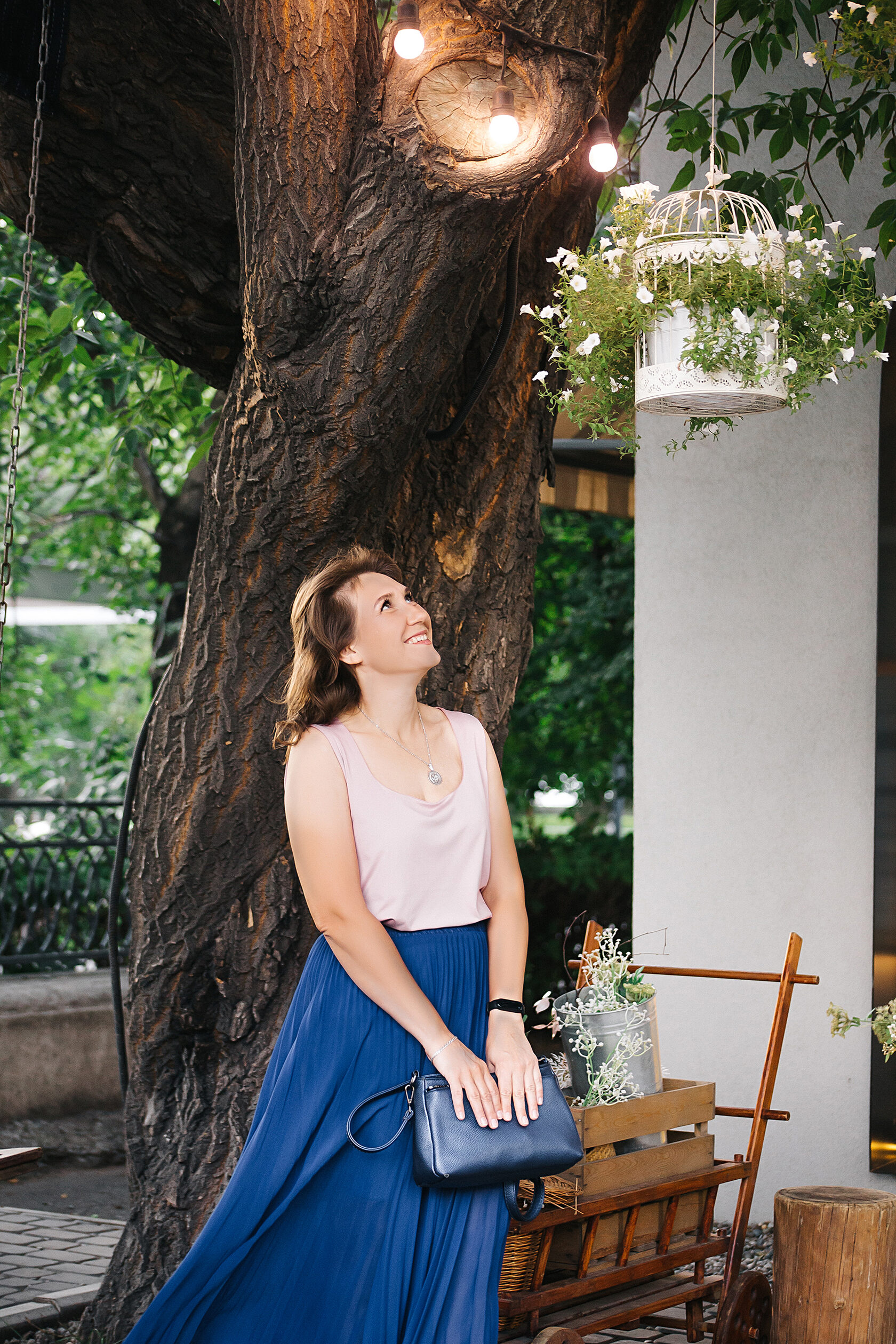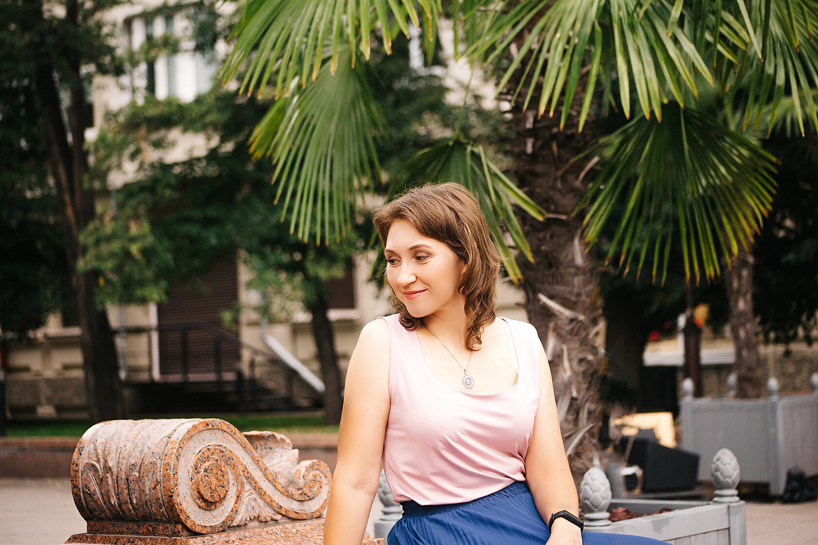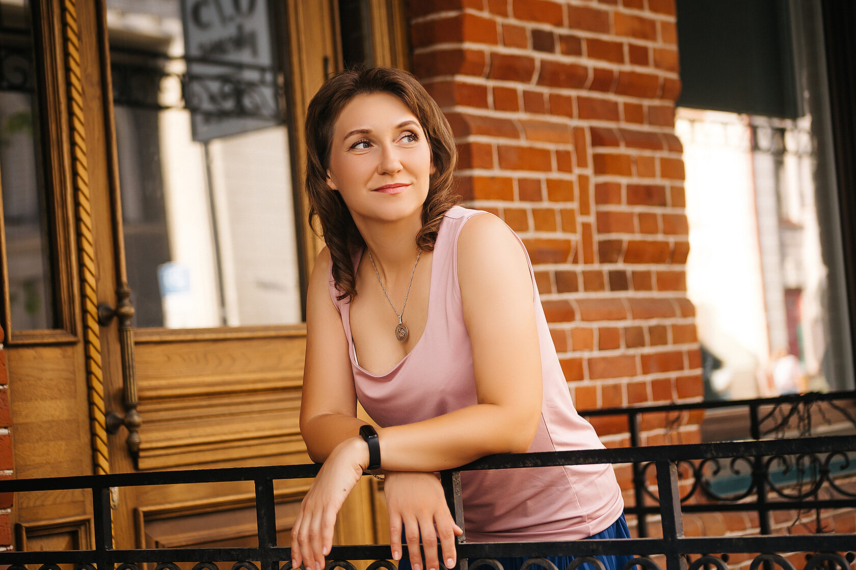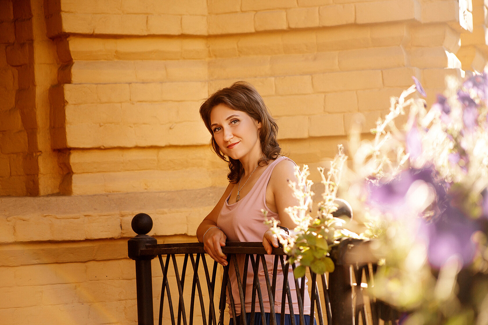 Взгляд в сторону добавит естественности. Используйте перила, чтобы подчеркнуть декольте. (Снято у ресторана рядом с Домом Кино).